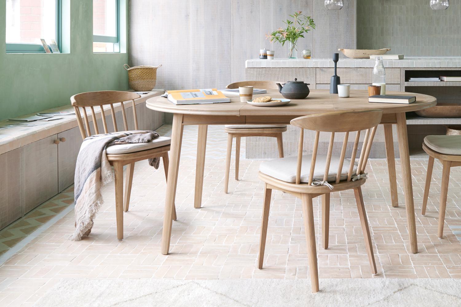 The shape of your kitchen or dining table is down to personal taste, but can also be informed by the size of your house and shape of your rooms. A round table is a really sociable style to choose, and works well in smaller spaces. An oval kitchen or dining table is ideal for narrower areas, while a rectangular table is great for larger rooms and open-plan kitchens.
