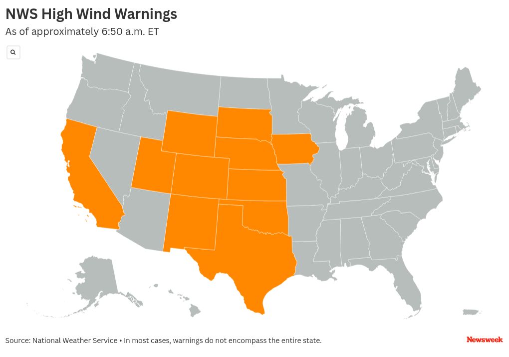 High wind warnings have also been issued for parts of Utah, Wyoming, Kansas, South Dakota, Iowa, Nebraska and Oklahoma.