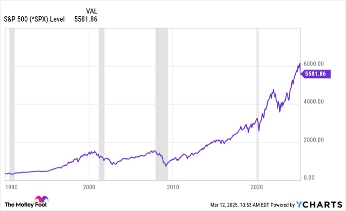 ^SPX data by YCharts The gray vertical sections indicate periods of recession.